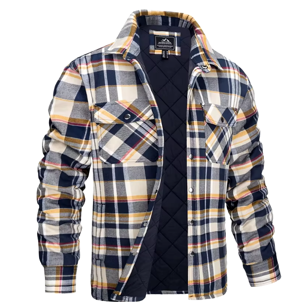 Deze gevoerde geruite herenjas combineert de warmte van een jas met de uitstraling van een overshirt. Het klassieke ruitpatroon en de contrasterende kleuren zorgen voor een tijdloze, stoere look. Ideaal voor frisse dagen in het najaar of de winter.